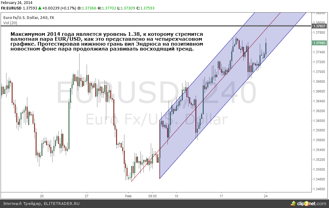 Рассмотрим ситуация на валютной паре евро к доллару США. Максимумом 2014 года является уровень 1.38, к которому стремится пара EUR/USD, как это представлено на четырехчасовом графике внизу. Протестировав нижнюю грань вил Эндрюса, на позитивном новостном фоне валютная пара продолжила развивать среднесрочный восходящий тренд.