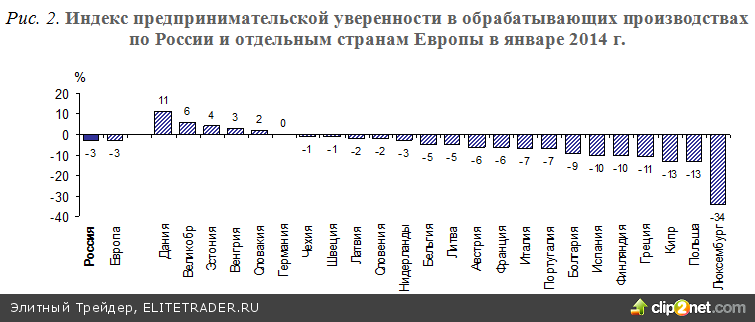 Рис. 2. Индекс предпринимательской уверенности в обрабатывающих производствах по России и отдельным странам Европы в январе 2014 г.