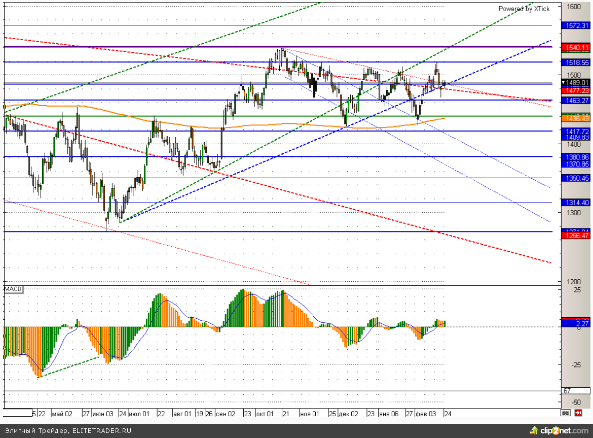 Российский рынок закончил торговый день нейтральной динамикой. ММВБ в конечном итоге вырос на 0,06% и так и не смог показать даже незначительного отскока от уровня 1485, где проходят сразу 2 трендовые линии. Консолидация продолжается уже третий день, и чем дольше она будет проходить, тем сильнее и быстрее будет дальнейшее импульсное движение.