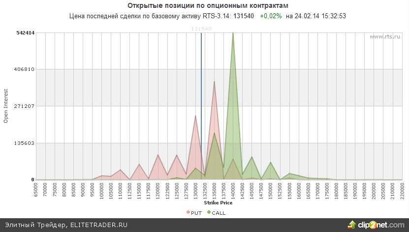 Между тем открытые опционные позиции по RIH4 со сроком исполнения 15.3.14 сейчас находятся в состоянии покупки. На уровне 130000 находится достаточно большое количество открытых опционов пут, которые выступают как сильная поддержка. При этом эквивалентное количество опционов колл находятся только на уровне 140000.