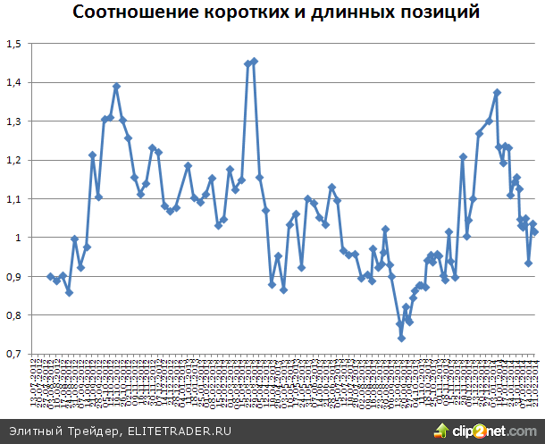 Обратив внимание на открытые юридическими лицами позиции по фьючерсу на индекс, можно заметить, что настроения крупных игроков за последние несколько дней немного улучшились, но теперь полностью стали нейтральными. Соотношение коротких и длинных позиций по данным на пятницу составляет 1,017, против 1,038 неделей ранее.