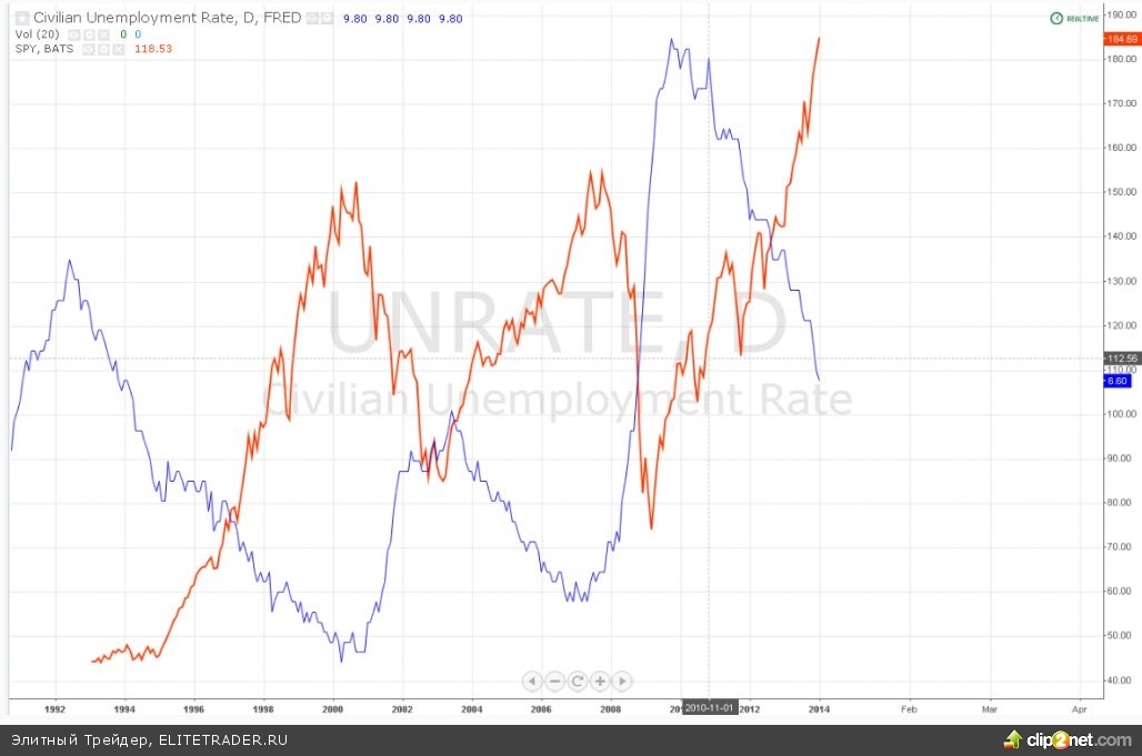 SnP500 все растет и растет. Сколько можно? Когда закончится этот беспредел? Наверное, улучшение ситуации на рынке труда сейчас является позитивным аспектом, который и отыгрывает SnP500. Связь уровня безработицы в США и SnP500 вы можете наглядно наблюдать на нижеприведенном графике. Вертикальными черными линиям я отметил экстремумы 2 временных рядов: