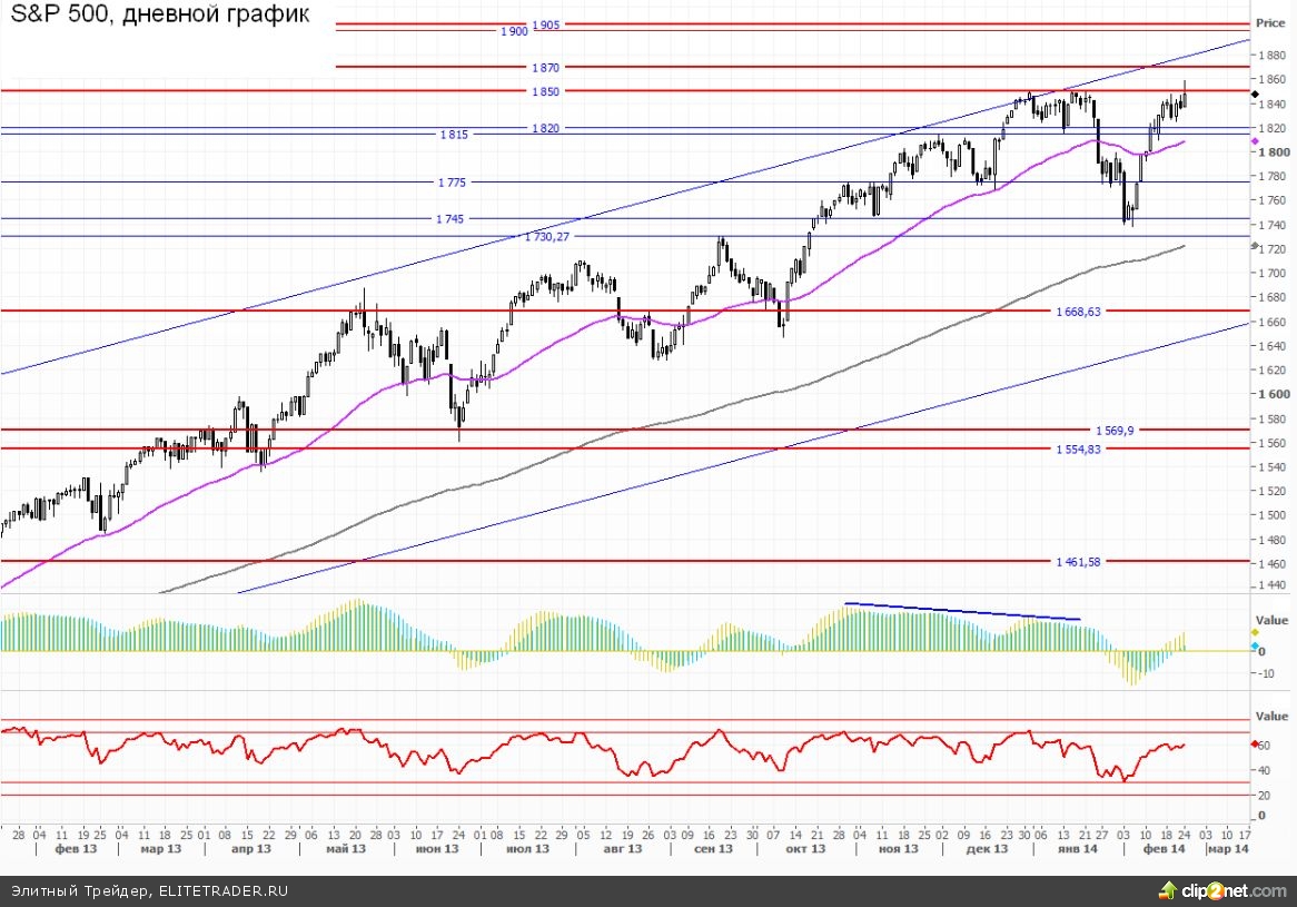 На западных площадках в понедельник преобладали бычьи настроения. Абсолютное большинство европейских индексов завершали первый день недели на положительной территории. Ну а за океаном инвесторы все-таки не удержались от соблазна обновить исторические максимумы. Индекс широкого рынка SnP 500 в рамках сессии успел переписать верхний экстремум, открыв тем самым дорогу в район 1870-1875. Остаюсь приверженцем той теории, согласно которой в данный момент мы наблюдаем за затяжной фазой дистрибуции, то есть за масштабным, но «аккуратным» процессом выхода из рынка. Крупные фонды с наименьшим влиянием на изменение индексов пытаются реализовать имеющиеся длинные позиции, периодически умышленно выдергивая рынок (запахло теорией заговоров). Сказать сколько продлится этот неприятный период очень сложно, но в любом случае по его завершению нас ждет коррекция как минимум на 15%. Максимальный потенциал роста не предполагает движение выше области 1900-1905 по индексу SnP 500.