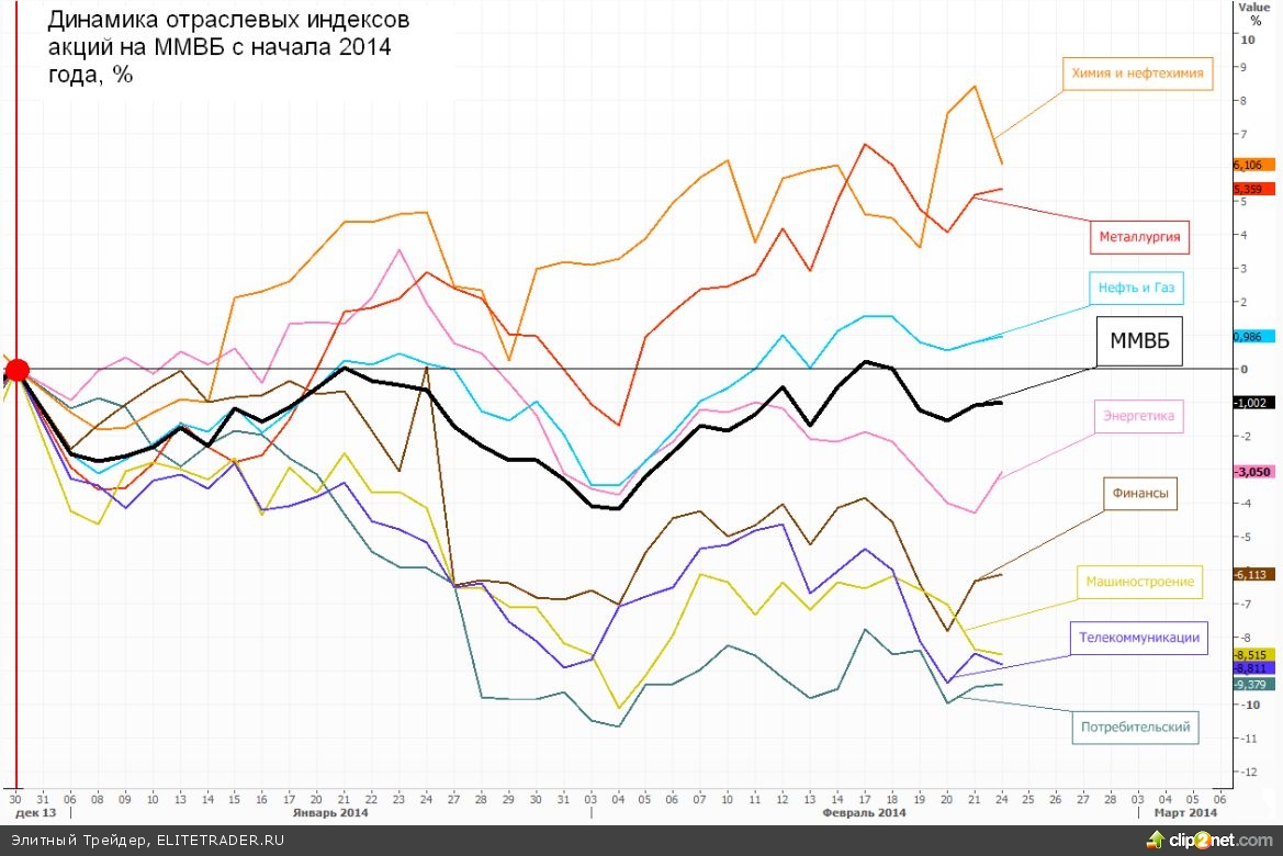 Если рассматривать отдельные сектора, то с начала 2014 года лучше остальных смотрятся металлурги, а также химия и нефтехимия. Среди аутсайдеров выделяется лидер прошлого года - потребительский сектор. Кроме того хуже рынка выглядят и представители сектора машиностроения и телекоммуникаций.