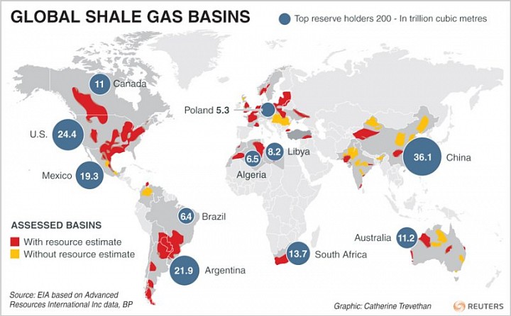 Вот ровно год назад Газпром упал до 100 рублей (ранее у меня был прогноз что он упадет и сравняется в какой-то момент со Сбербанком). Тут и там говорили про сланцевй газ и сланцевую революцию. Вот такие карты с огромными запасами стали появлятся везде.