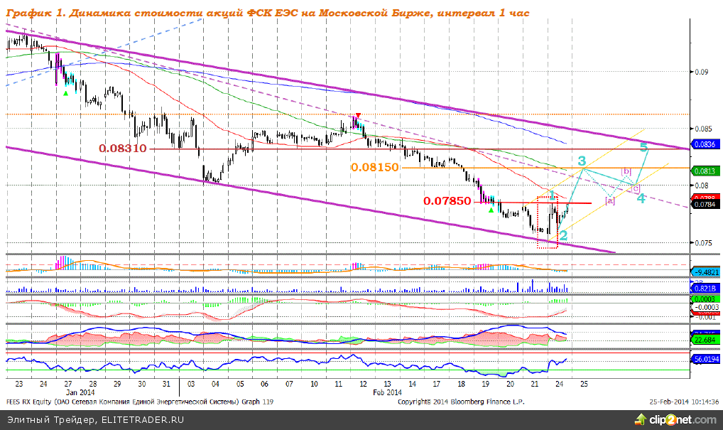 Котировки акций ФСК ЕЭС движутся в рамках нисходящего ценового коридора, который обозначен на графике, приведенном выше, широкими сиреневыми линиями. Вчера, в начале торговой сессии, ФСК ЕЭС коснулся нижней границы коридора, сформировав фрактал – что говорит о смене тренда, и направился вверх. Локальное сопротивление, преодоление которого также формирует разворотную формацию, находилось на отметке 0,07850 рубля, которая сегодня преодолена, что дало дополнительный сигнал к росту. Исходя из распределения волн, мы полагаем, что целью локального роста котировок акций ФСК ЕЭС является уровень 0,08310 рубля за акцию. Индикаторы: MACD на часовом графике сформировал сигнал вверх. Индикатор повышения DMI+ находится чуть выше индикатора понижения DMI-, индикатор силы тренда ADX расположен в средней части шкалы и направлен горизонтально, что говорит о начале развития восходящего локального тренда, что стало результатом начала формирования восходящей волны 3. Индикатор, основанный на динамике ADX, в настоящее время выглядит нейтрально. Осциллятор RSI 19-21 февраля побывал в зоне перепроданности, сформировав уверенный сигнал к повышению. Рекомендуем: покупать акции ФСК ЕЭС по текущей цене (0,07900 рубля за акцию) с целью продать на уровне 0,08310 рубля за акцию (+5,19%), стоп-приказ на отметке 0,08000 рубля (-1,27%), временная перспектива - 1 неделя. Поддержка: 0,07850; 0,07710; 0,07508-0,07510. Сопротивление: 0,08070; 0,08150; 0,08310-0,08380.