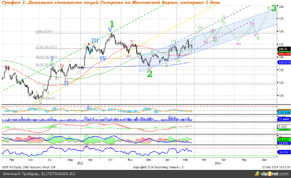 Котировки «Газпрома» продолжают реализовывать восходящий импульс, в рамках которого формируется восходящая волна 3. Данная волна формируется в рамках ценового коридора, который обозначен на графике 1 синим цветом. В настоящее время в пределах синего канала формируется нисходящая локальная коррекция, по окончании которой мы ожидаем возобновления роста котировок акций газовой компании. Индикаторы: MACD на дневном графике в конце февраля 2014 года сформировал сигнал вверх. Индикатор повышения DMI+ и индикатор понижения DMI- сошлись, индикатор силы тренда ADX расположен в средней части шкалы и направлен вниз, что говорит о прекращении нисходящего тренда и возможном начале развития среднесрочного восходящего направления движения котировок компании, что стало результатом начала формирования восходящей волны 3. Индикатор, основанный на динамике ADX, в настоящее время выглядит нейтрально. Осциллятор RSI в январе-феврале коснулся зоны перекупленности, сформировав сигнал к снижению, что может стать сигналом к локальной коррекции, чем можно воспользоваться для формирования длинных позиций. Рекомендуем: покупать акции Газпрома по цене 143,00 рубля за акцию с целью продать (по окончании реализации волны [3’]) на уровне 166,70 рубля за акцию (+16,57%), стоп-приказ на отметке 141,50 рубля (-1,05%), временная перспектива – 2 месяца. Поддержка: 146,10; 145,80; 142,70; 141,50; 138,90. Сопротивление: 150,00; 152,20; 153,85; 156,30; 159,10.