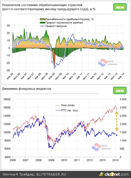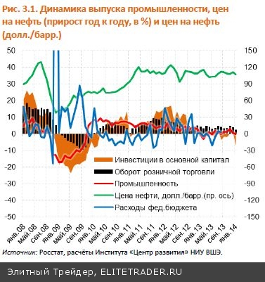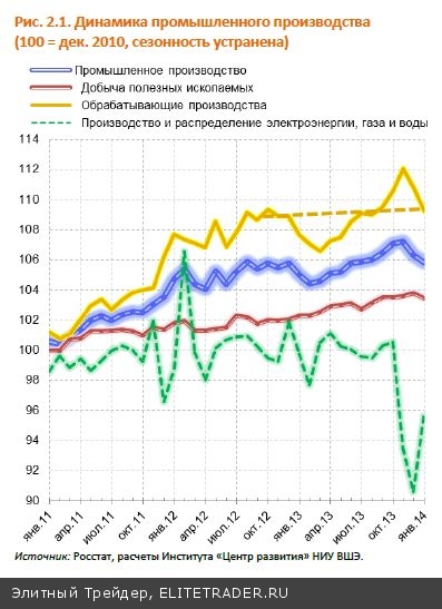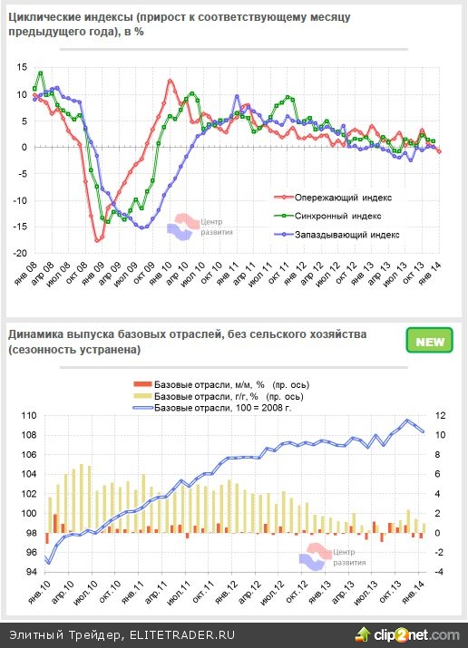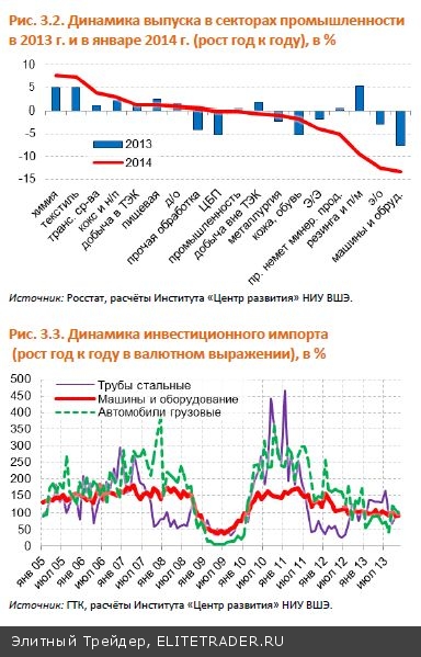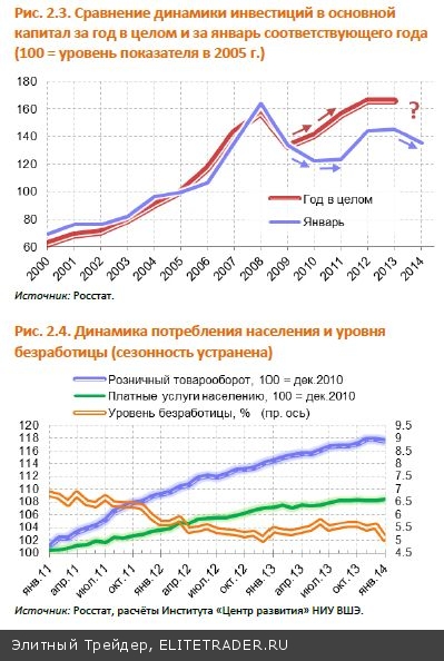 Ухудшение сразу многих макроэкономических показателей в первом месяце 2014 года оказалось столь явным, что оно позволяет говорить о начавшемся спаде, несмотря на то, что январские данные обычно тяжело поддаются анализу из-за огромного искажающего влияния календарного фактора. Накапливавшаяся в течение прошлого года инерция говорила скорее в пользу сохранения траектории стагнации, с медленным ростом экспорта (развитые страны – потребители российских энергоресурсов – постепенно восстанавливаются) и вялой динамикой потребления и инвестиций на фоне низкой деловой активности.