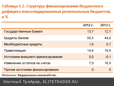 Бюджетный дефицит консолидированных региональных бюджетов в 2013 г. вырос до 640 с 279 млрд. руб. в 2012 г. В таблице 5.2 представлена структура источников финансирования дефицитов региональных бюджетов. Структурные изменения в 2013 г. не очень существенны. Отметим сокращение доли банковского кредитования, при увеличении долей кредитов из федерального бюджета и использования остатков на счетах. Тем не менее чистые поступления от банковских кредитов на финансирование дефицита в 2013 г. выросли на 74%, использование остатков на счетах возросло в 5 раз. По словам министра финансов А. Силуанова, произнесенным на Гайдаровском форуме в январе 2014 г., в 2013 г. регионы израсходовали бюджетные остатки на счетах.