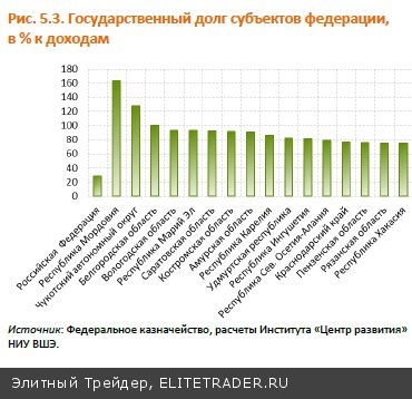 Долг субъектов федерации в 2013 г. вырос более чем на 10% (мы располагаем данными по долгу за 11 месяцев 2013 г.). Отношение государственного долга регионов к доходам региональных бюджетов без учета межбюджетных трансфертов в 2013 г. приблизилось к 30%. По двум регионам (Республика Мордовия и Чукотский автономный округ) это отношение превышает 100%, еще в 14 регионах данное отношение превышает 70% (рис. 5.3).