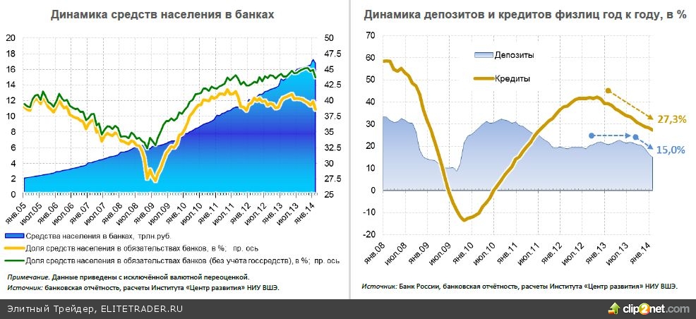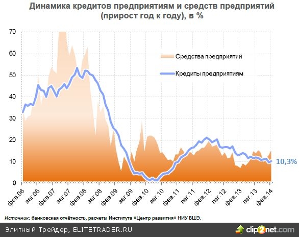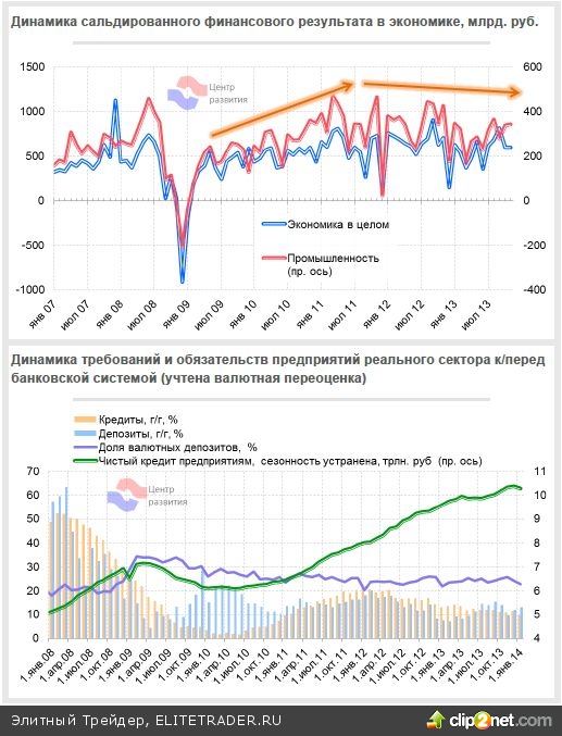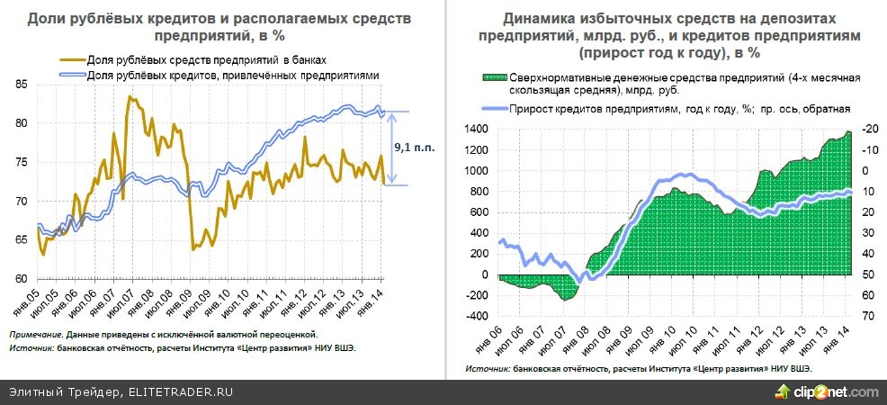 В январе 2014 г. объём средств в распоряжении предприятий вырос на 0,7% (прирост год к году составил 15,2%). Продолжился переток средств клиентов из частных банков, где остатки уменьшились на 6,5%, в государственные (рост на те же 6,5%). В результате по состоянию на 1 февраля в госбанках было размещено 58,5% всех средств предприятий реального сектора. Объём «избыточных» средств предприятий оказался чуть выше уровня 1,2 трлн. руб. Доля рублёвых остатков упала на 3,5 п.п., до 72,3%, доля кредитов в рублях составила 81,4%.