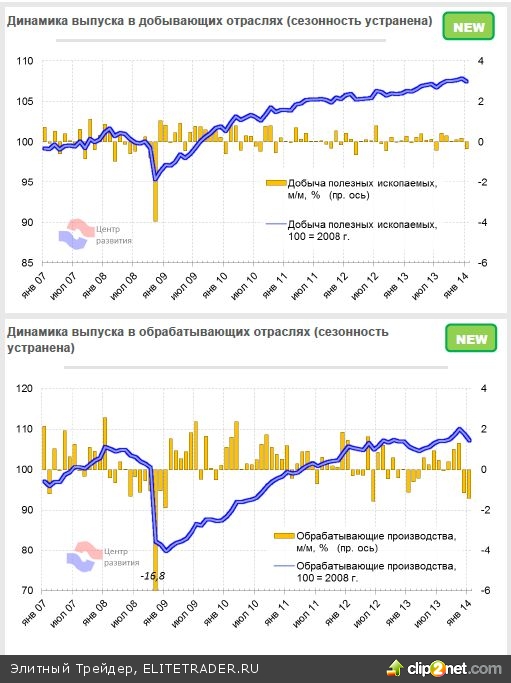 Впрочем, окончательный вывод о скатывании и промышленности, и экономики в целом в рецессию делать пока рано. Так, например, в январе-феврале, мае и августе прошлого года объем промышленного производства тоже сокращался по отношению к тому же периоду прошлого года – в феврале 2013 г., по уточненным данным Росстата, даже на 3,1%, однако в целом за прошлый год промышленность все-таки подросла на 0,3%.