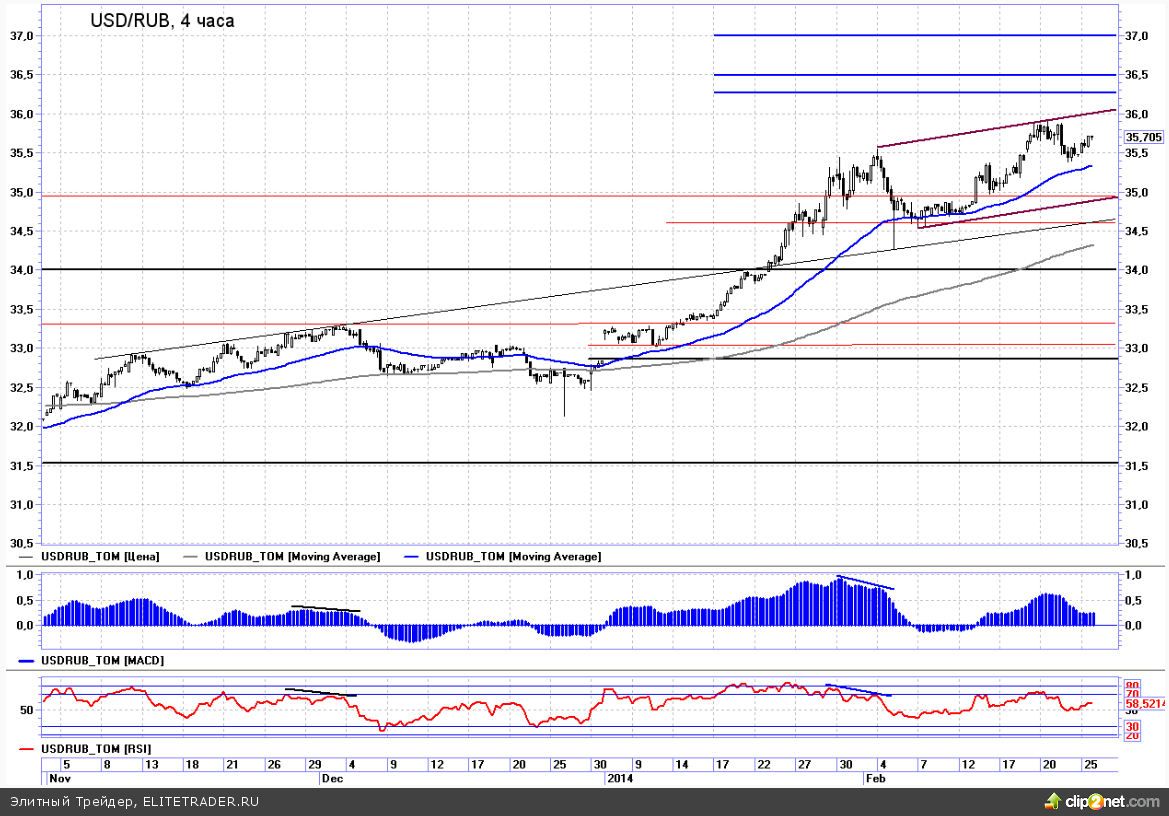 Что касается валютного рынка, то пока мы отмечаем, что рубль все-таки не желает идти по сценарию запланированной коррекции. По итогам вторника пара доллар/рубль снова поднялась выше 35,70, что заставило нас поставить под сомнение озвученный ранее расклад с укреплением национальной валюты в самой ближайшей перспективе. Думаю, что в течение 1-2 сессий станет точно понятно, какой вариант начинает реализовываться: или сначала идем на затяжную коррекцию в район 34-34,20, или же эта коррекция откладывается до тех пор, пока мы не посетим целевую область сопротивления 36,5-37, обновив тем самым исторические максимумы по доллару против рубля.