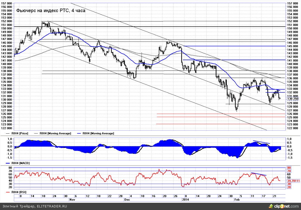 После достижения целевой зоны сопротивления в районе 132000-133000 котировки фьючерса развернулись и медленно пошли вниз. В данный момент есть все основания рассчитывать на продолжение развития негативного сценария с точки зрения технического анализа. Сегодня RIH4 все так же находится в пределах среднесрочного нисходящего канала, трендовые индикаторы преимущественно смотрят вниз.