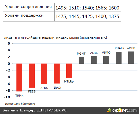 Индекс ММВБ в первой половине недели дважды протестировал отметку 1510 пунктов, днем во вторник в моменте поднимаясь до 1518. Однако с этого уровня он развернулся вниз и в течение следующих двух суток снижался, остановившись в четверг только в районе 1470 пунктов. В конце недели часть потерь была отыграна, индекс поднялся до 1487,64 пунктов (-0,57%).