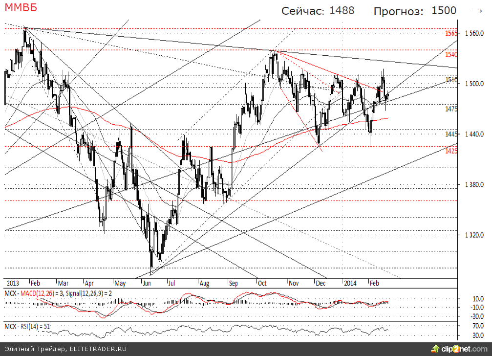 Разворот индекса вниз в начале прошлой недели, казалось бы, наметил очередное движение к нижней границе бокового диапазона 1425 - 1510 пунктов. Однако оно остановилось у ближайших горизонтальных поддержек и быстрых скользящих средних (21 и 50 дней). Полагаем, что пока индекс остается выше минимума прошлой недели, сценарий