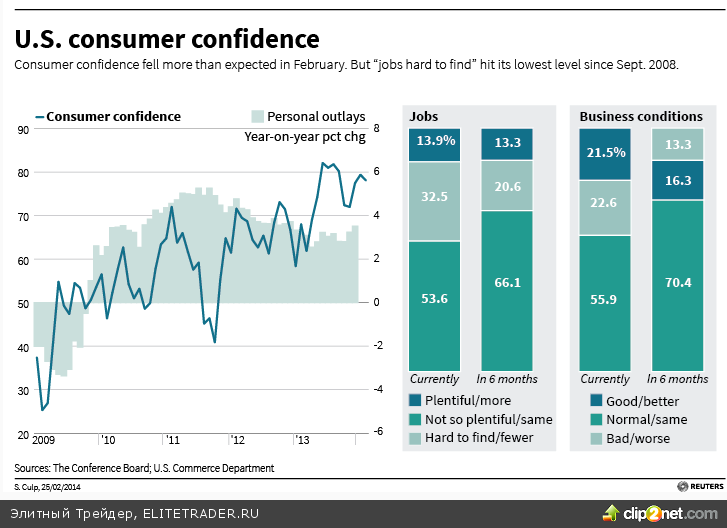 В то же время после публикации слабых данных по индексу потребительского доверия от Conference Board за февраль пошла волна покупок. Индекс снизился до 78,1 пункта, против ожидаемых 80 пунктов. При этом предыдущее значение было пересмотрено с 80,7 до 79,4 пункта. Тем не менее, комментарии главы исследовательской группы - Линн Франко, указывают на то, что потребители по-прежнему считают, что экономика улучшилась, но они несколько озабочены краткосрочными перспективами.