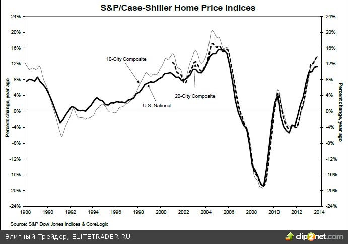 Обнародованная вчера статистика едва ли чем-то всерьез удивила участников рынка. Данные по рынку жилья указали на замедление темпов роста цен на дома по индексу SnP/Case-Shiller в 20 столичных регионах c 13,7% до 13,4% в годовом выражении. В месячном выражении индекс поднялся на 0,8%, против прогнозных 0,6%, хотя и здесь отмечается замедление темпов роста с ноябрьских 0,9%. Рост ипотечных ставок и суровые погодные условия давлели над активностью на рынке в декабре.