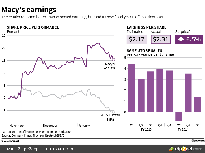 Порадовала инвесторов и прибыль одной из крупнейших и старейших сетей розничной торговли в США - Macy's, которая выросла до $811 млн, или $2,16 на акцию. Без учета разовых расходов показатель вырос до $2,31 на акцию, что на 14 центов больше, чем консенсус-прогноз. В текущем финансовом году Macy's подтвердила свой прогноз по прибыли на уровне $4,40- $4,50 на акцию и роста продаж на 2,5%-3%. Акции Macy's подорожали на 6%. Сегодня свои отчеты представят еще несколько крупных ритейлеров включая Lowe`s, Target, The TJX Companies, J C Penney.