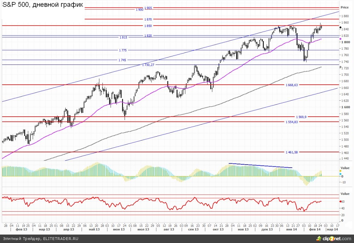 Ранее мы уже много раз отмечали, что факт обновления экстремума (1850) сразу же передвигает целевой ориентир роста в район важной зоны сопротивления 1870-1875. Именно эти рубежи в данный момент выступают в качестве основного ориентира восходящей тенденции.