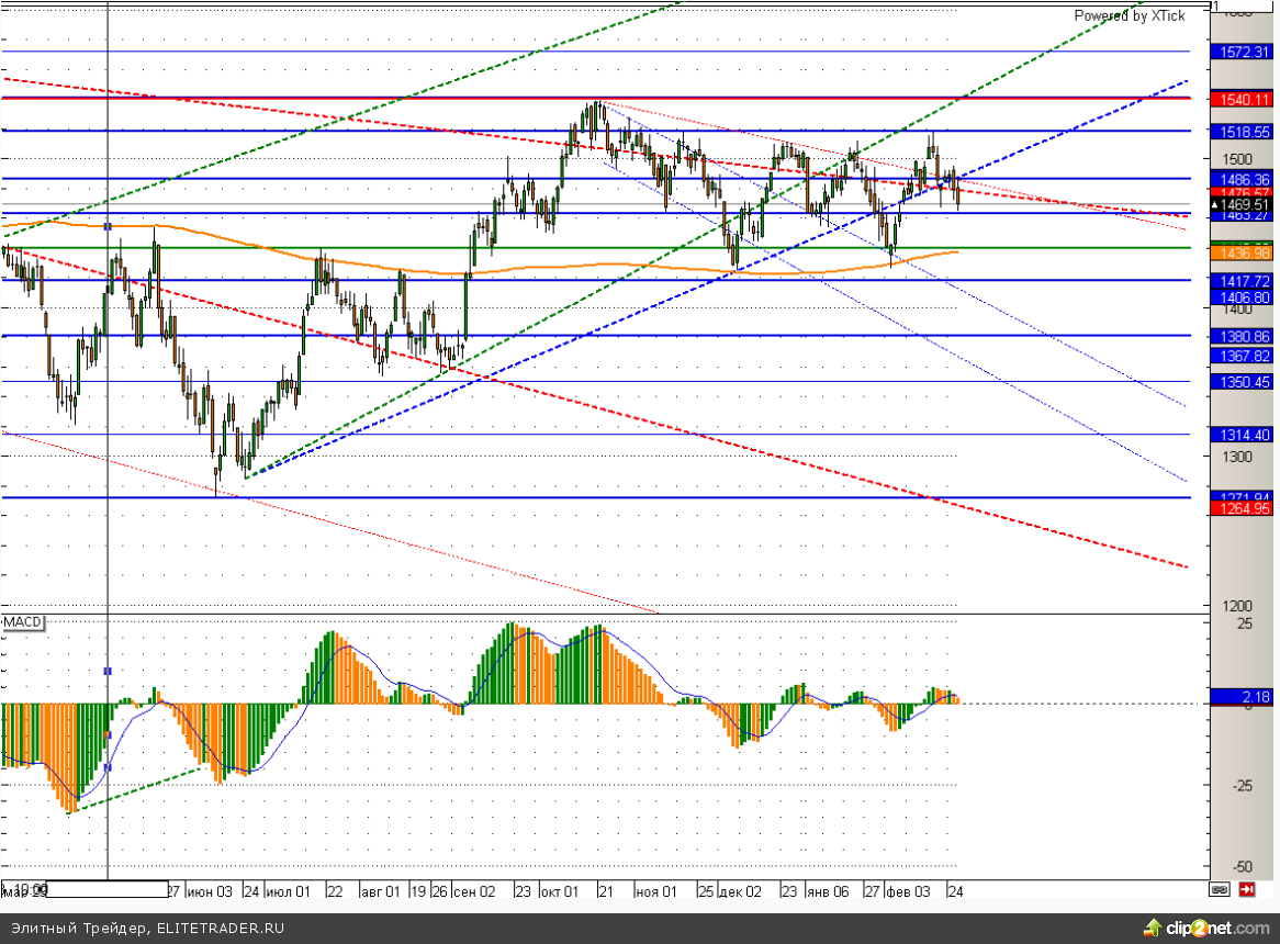 В результате индекс ММВБ закончил день снижением на 0,66% и продолжает торговаться ниже восходящей трендовой линии, что увеличивает шансы на продолжение снижения в ближайшем будущем. Ближайшей надеждой «быков» теперь стала отметка 1460, пробой которой будет сигнализировать об окончательной смене тренда на «медвежий».
