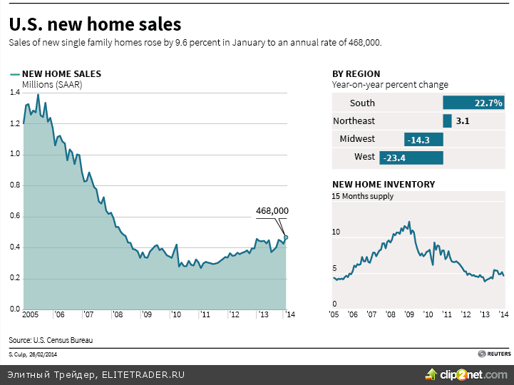 Обнародованная вчера статистика по продажам новых домов удивила участников рынка. Слабые данные по рынку жилья за декабрь-январь выходившие ранее объяснялись ростом ипотечных ставок и суровыми погодными условиями. Но вместо ожидаемого аналитиками снижения продаж до 400 тыс., отчет Минторга указал на рост до 468 тыс., то есть самого высокого уровня с июля 2008 года.