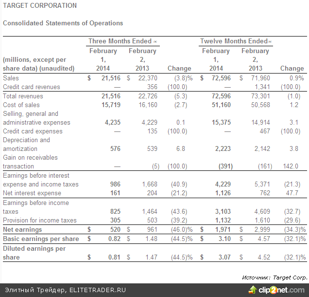 Напомним, во вторник акции Home Depot и Macy's подорожали после отчетов на 4% и 6%, и вчера в бумагах рост продолжился, составив 0,9% и 3% соответственно. Вчера отчитался третий по объему продаж ритейлер в США - Target, акции которого выстрелили на 7%. Компания завершила весьма непростой квартал, сезон распродаж, на фоне появившихся на тот момент новостей о кибер-атаках и краже данных платежных карт. Тем не менее, падение показателей на Wall-Street переоценили. Чистая прибыль Target сократилась на 46% до $520 млн. Скорректированная прибыль на акцию составила 90 центов против прогнозных 79 центов. Выручка сократилась на 5,3% до 21,516 млрд., но консенсус прогноз предполагал еще меньшие цифры на уровне $21,447 млрд.