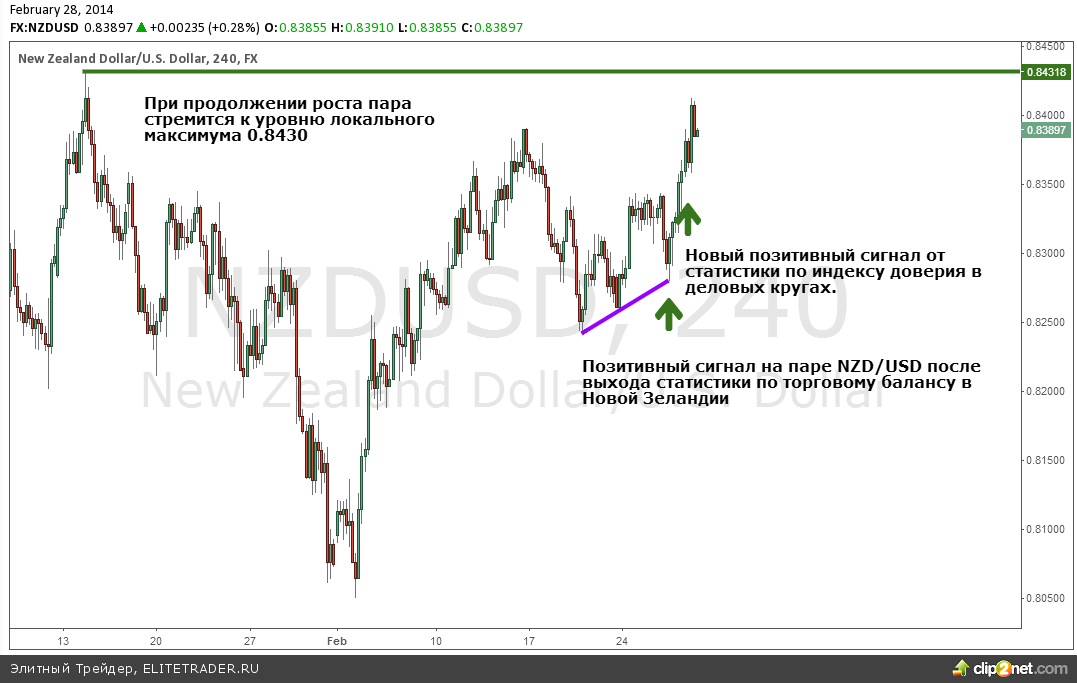 Сегодня утром опубликовали расчеты по индексу доверия в деловых кругах в Новой Зеландии от ANZ за февраль. Реальное значение составило 70.8 пунктов, что превысило январское значение в 64.1 пункта. Позитивная макроотчетность поддержала развитие позитивного тренда на новозеландском долларе против доллара США, оттолкнувшегося от трендовой линии поддержки. Для пары NZD/USD сопротивлением для восходящего движения выступит уровень 0.8430.