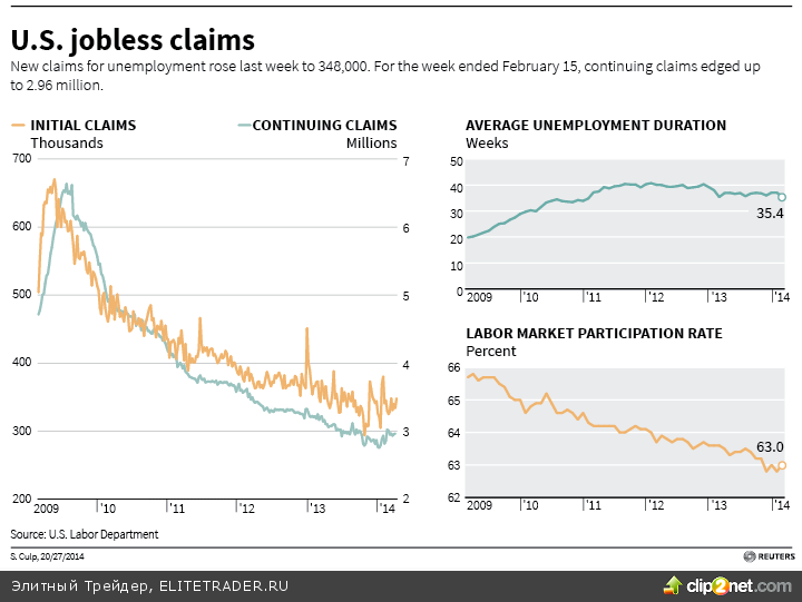 Данные по первичным обращениям за получением пособий по безработице указали на рост заявок с пересмотренных 334 до 348 тыс., тогда как аналитики ожидали 335 тыс. Впрочем, делать какие-то серьезные выводы здесь сложно. За первые три недели февраля среднее составляет порядка 340 тыс., что несколько больше январского среднего 333 тыс. В большей степени конечно инвесторов волнует февральский месячный отчет по рынку труда, который выйдет на следующей неделе, и от которого вероятно в значительной степени будет зависеть мартовское решение ФРС.
