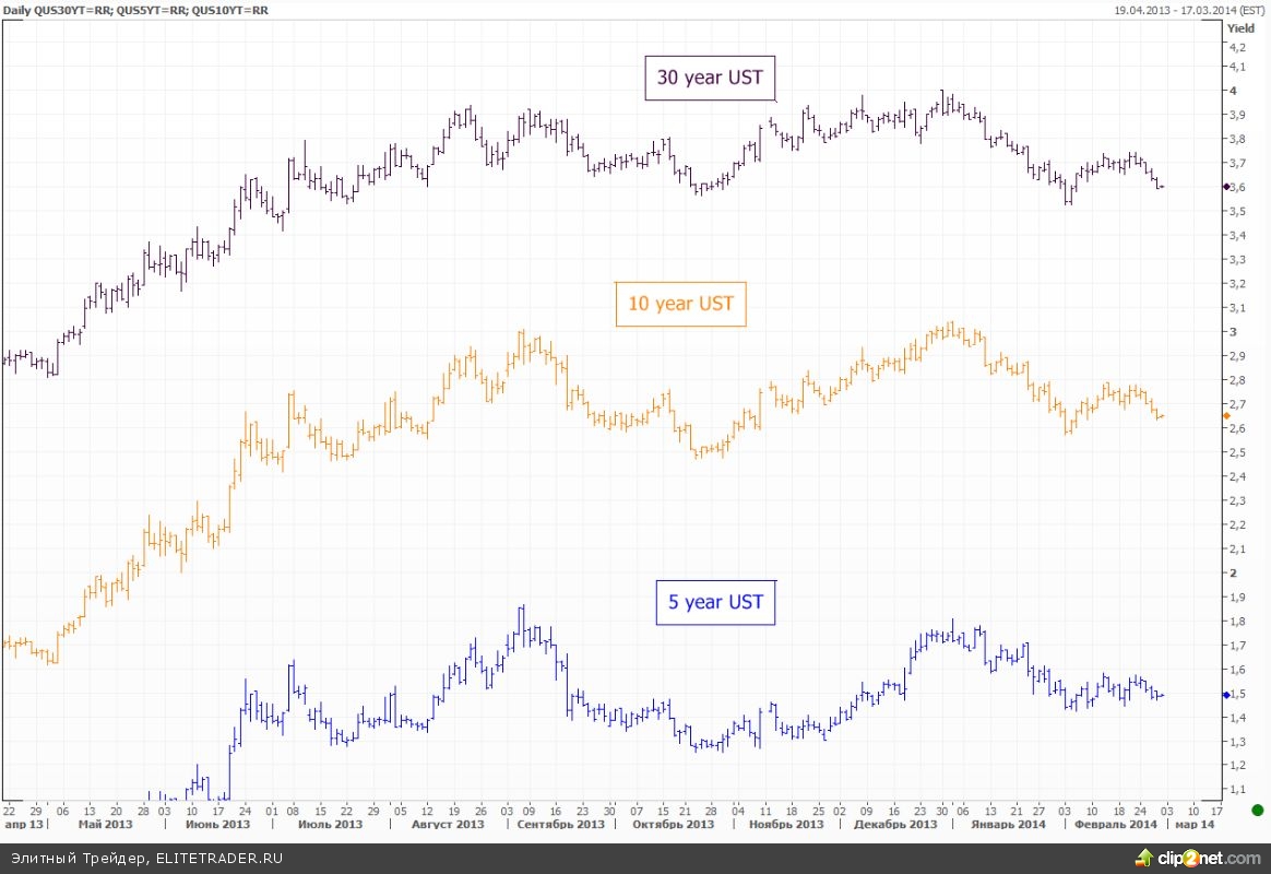 В то же время параллельно с ростом рисковых активов на американских площадках, не без влияния напряженной ситуации на Украине, проходит рост в американских казначейских облигациях. Инвесторы уходят в долларовые активы. Доходность среднесрочных/долгосрочных облигаций все ближе спускается к февральским минимумам.