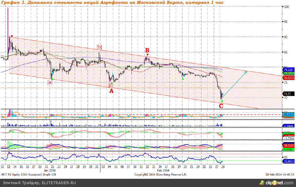 Стоимость акций Аэрофлота корректировалась после бурного роста, который наблюдался в конце 2013-начале 2014 года. Коррекция в настоящий момент сполна реализовала как волновую структуру, так и уровневый аспект, индикаторы находятся в стадии возможного быстрого формирования сигнала к росту. Ожидаем локальный рост к отметке 78,50 рублей за акцию, см график 1. Индикаторы: MACD на часовом графике отрабатывает сигнал вниз, исходя из индикатора, снижение приблизилось к концу, и вскоре вероятно формирование сигнала к росту. Индикатор повышения DMI+ находится ниже индикатора понижения DMI-, индикатор силы тренда ADX расположен в верхней части шкалы и направлен вверх, нисходящий тренд на пике, и вскоре может логично произойти смена вектора движения котировок акций транспортной компании. Индикатор, основанный на динамике ADX, сформировал сигнал вверх, что наряду с достижением нижней границы ценового коридора и с окончанием формирования волновой структуры указывает на высокую вероятность роста, как минимум в рамках канала. Осциллятор RSI в зоне перепроданности, при этом сигнал к росту уже сформирован. Рекомендуем: покупать акции Аэрофлота по текущей цене (71,71 рубля за акцию) с целью продать на уровне 78,50 рубля за акцию (+9,47%), стоп-приказ на отметке 70,00 рубля (-2,38%), временная перспектива – 2 недели. Поддержка: 70,00; 69,62; 66,50; 61,00; 60,00. Сопротивление: 73,20; 76,30; 78,50; 81,40; 83,20.