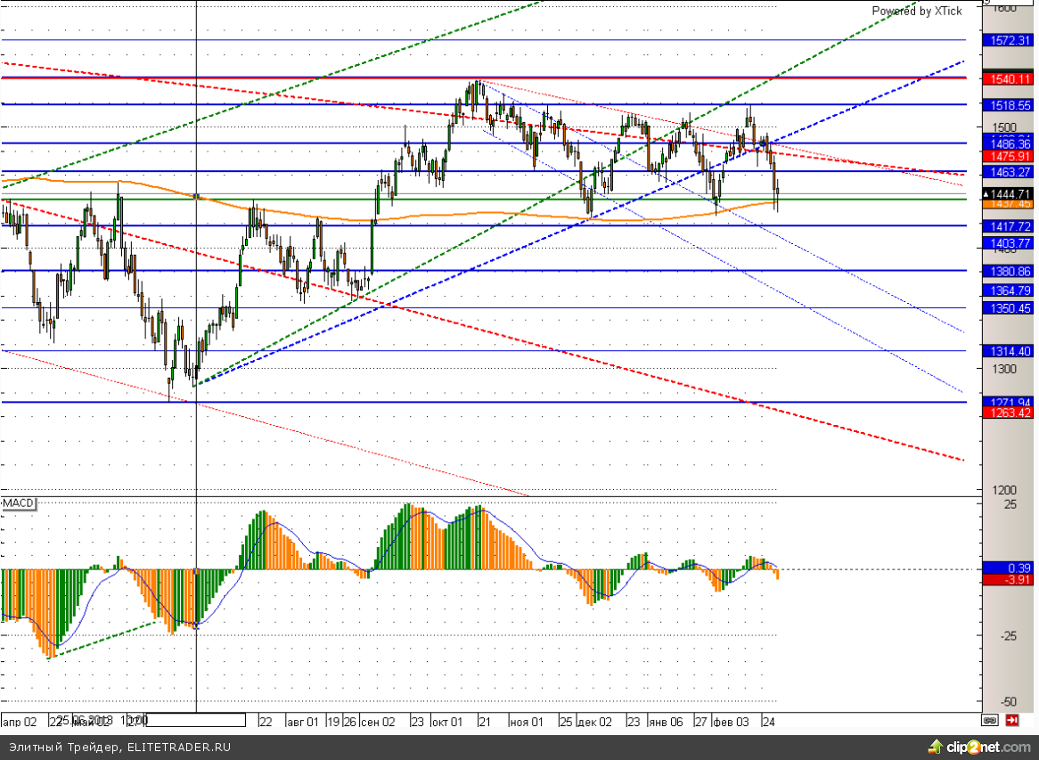 Российский рынок завершил торговую сессию пятницы снижением на 0,28% по ММВБ. Индекс продолжает торговаться ниже сразу двух трендовых линий, и находится в относительно шатком положении. В частности, если состоится пробой уровня 1430, то снижение может значительно ускориться.