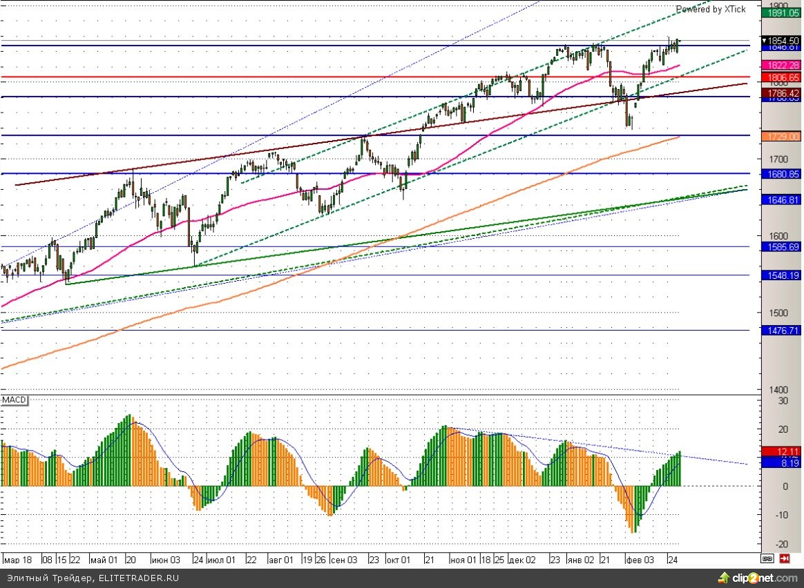 Индекс SnP500 накануне преодолел значимое сопротивление на уровне 1850. Теперь путь наверх открыт, и ближайшая цель роста располагается в районе 1900. «Медведям» остается лишь надеяться, что сегодняшняя статистика выйдет в негативном ключе и SnP500 закроет день ниже 1850.