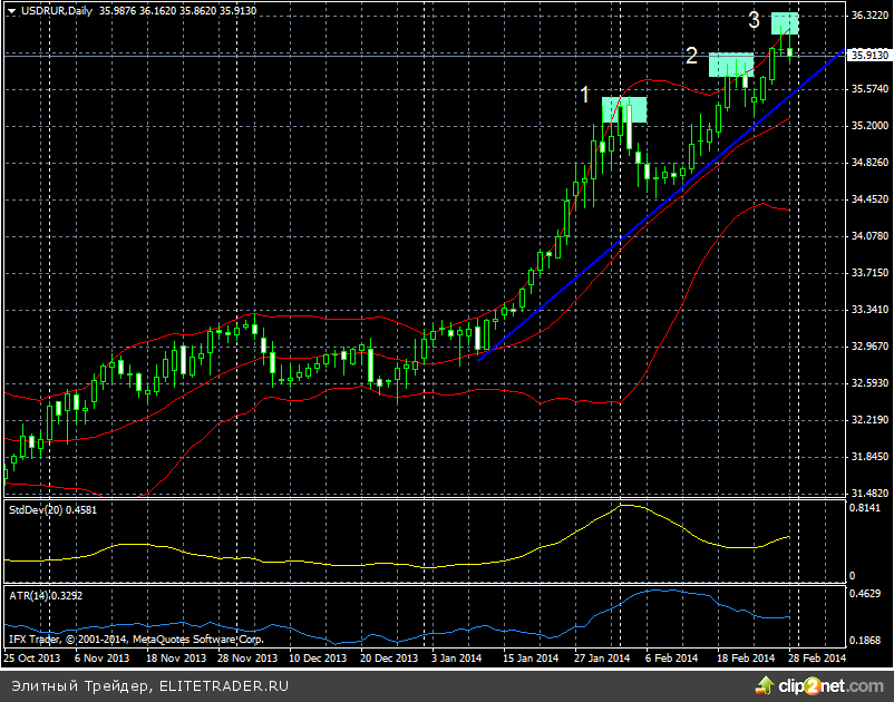 В зависимости от фактического развития ситуации в добрососедских отношениях России и Украины можем получить дополнительные импульсы для падения рубля. Днем 28 февраля пара доллар/рубль торговалась по 36,12, достигнув накануне значения 36,24. Курс евро/рубль уже превысил 49,52. Но, как известно, любой конфликт имеет определенные закономерности развития, и при этом стратегические игроки, как правило, играют на опережение.