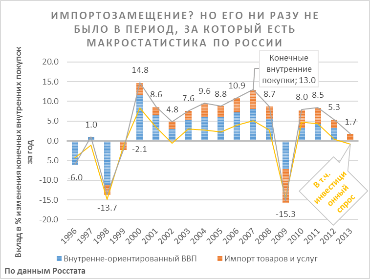 Эти умозрительные соображения (в действительности может быть так, а может - и иначе) находят поддержку в данных по динамике элементов ВВП России за 1996-2013. На верхнем графике видно, что падение спроса на импорта ни разу ни приводило к росту «внутренне-ориентированного ВВП» (т.е. ВВП за вычетом экспорта, в котором, кстати – к рассуждениям о повышении доли добавленной стоимости в экспорте, эта доля всегда составляет ровно 100%, без учета реэкспорта), исключая, может быть лишь 1999 год, в котором этом эффект находится в пределах статистической погрешности. Видно также, что объем инвестиций в страну также довольно тесно коррелирован с размерами импорта. (Исключение, возможно, составляют только последние годы, когда импорт товаров снизил свои темпы до нуля уже в середине 2012 года (по показателю «к соответствующему периоду прошлого года»), а импорт услуг (это главным образом – зарубежные турпоездки и связанные с этим транспортные услуги) рос в тот же период темпом 17-19% год.)