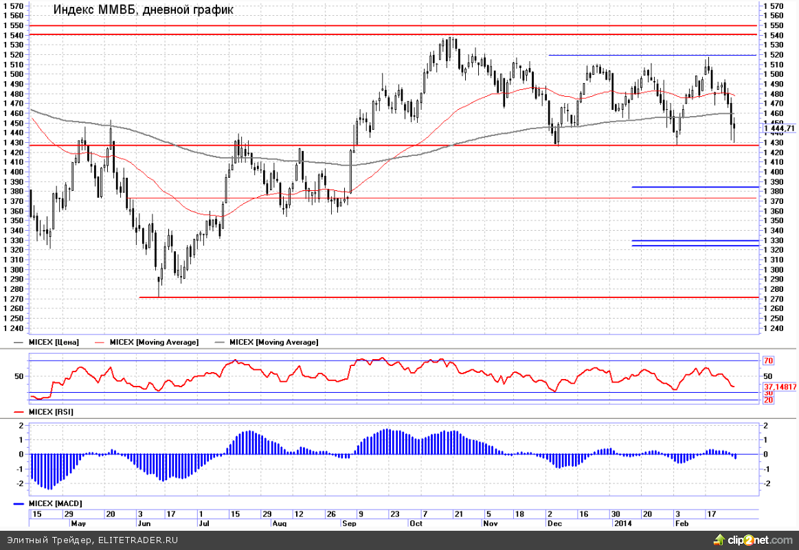 Четвертую сессию подряд завершил снижением российский рынок в отражении индекса ММВБ, потерявшего 0,28% в прошедшую пятницу. В целом неделя была, конечно, напряженной, и за этот период индекс почти реализовал нисходящую волну в рамках среднесрочного боковика 1425-1510. Казалось бы, теперь из района нижней границы боковика есть неплохие возможности для набора длинных позиций, в расчете на отскок и развитие новой волны роста в диапазоне. К покупкам склоняли и сигналы разворотной свечи на дневном таймфрейме.
