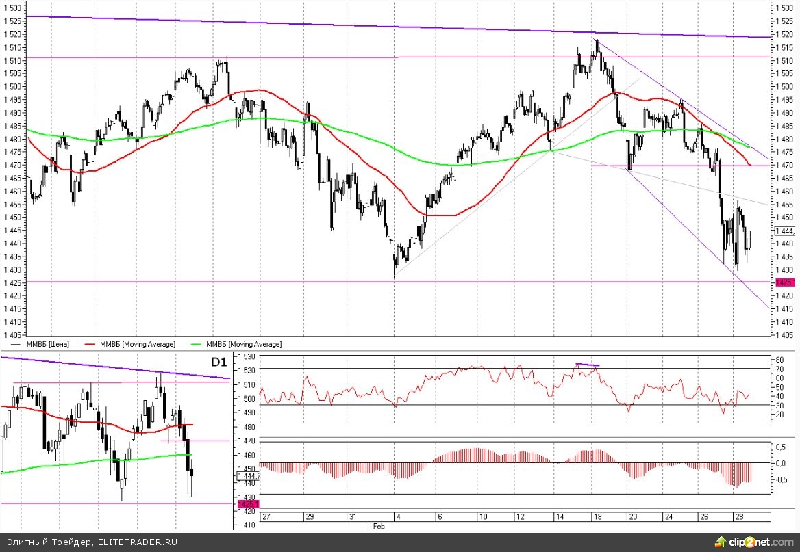 Таким образом, сегодня нас ожидает негативное начало торгов, и по индексу ММВБ у нас есть все шансы обновить пятимесячные минимумы, то есть выйти вниз из боковика 1425-1510, с ближайшей целью движения к 1400.