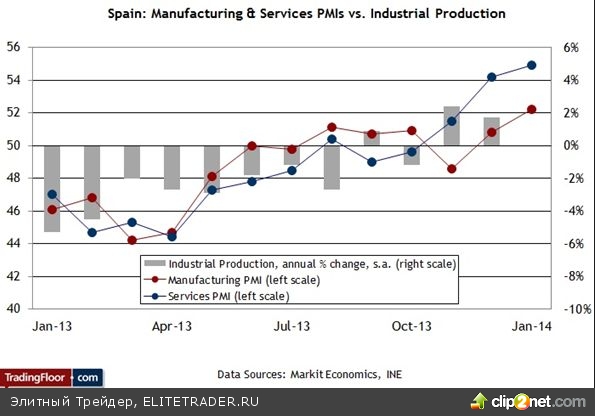 Сегодняшний отчет о PMI предлагает опережающую оценку ожиданий, которые в последнее время были позитивными, хотя рост их немного замедлился. Испания в одиночку не способна вытащить континент из кризиса, но в то же время трудно представить себе, что экономика Еврозоны сможет улучшить свои позиции в 2014 году без убедительного восстановления главной экономики Пиренейского полуострова.