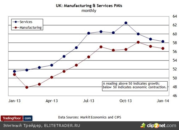 Производственный индекс PMI в Великобритании (09:28 GMT). Согласно большинству прогнозов, экономика Великобритании в этом году обойдет основные экономики Еврозоны по темпам роста. Например, в соответствии с текущей оценкой Еврокомиссии, экономика Германии вырастет на 1,8% по сравнению с ростом на 2,5% в Великобритании. Почему же тогда Банк Англии твердо намерен сохранять процентные ставки на низком уровне в ближайшем будущем, а, возможно, и после 2015 года? Может быть, потому что ЦБ ожидает, что темпы роста замедлятся?