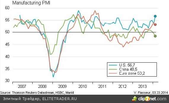 Тем временем, что касается других экономических новостей, то здесь все более менее позитивно. В частности цены на нефть превысили 110 долларов за баррель по сорту Brent, индекс деловой активности в непроизводственном секторе Китая вырос до 55 в феврале с 53,4 месяцем ранее. Индекс деловой активности в производственном секторе еврозоны вырос за февраль до 53,2, а аналогичный показатель России поднялся до 48,5 с 48 месяцем ранее.