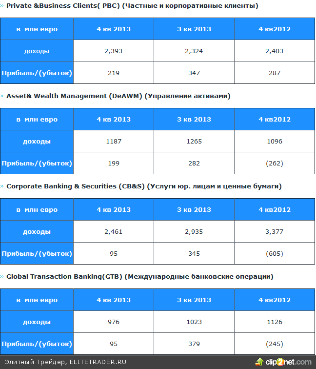 Набравшая в байнете популярность фраза вполне характеризует ситуацию в крупнейшем банке Германии. Более плохую отчетность Deutsche bank можно было увидеть только во время кризиса. Уже на протяжении нескольких лет банк в отдельных кварталах получает убытки, что негативно сказывается на его котировках (и это учитывая низкую стоимость фондирования в Европе и Америке). За 4-й квартал 2013 года банк объявил об убытках в размере 1,15 млрд евро. За аналогичный период 2012 года убытки составили 2,2 млрд евро. Основной причиной убытков за данный период стали судебные издержки в размере 528 млн евро («пока не могут простить прошлые грехи», хотя в данном сезоне отчетов у многих крупных банков судебные расходы достаточно серьезная статья расходов) и 1,144 млрд евро банк потратил на консолидацию и реструктуризацию. Доходы за 4 квартал снизились на 16 % и составили 6,6 млрд евро. Хуже всего проявили себя подразделения по работе с ценными бумагами и корпоративными банковскими услугами. С момента объявления о разделении бизнеса на инвестиционный и банковский (в основном данный сегмент занимает предоставление кредитов крупным корпоративным клиентам), банк постепенно сосредотачивается на инвестиционном бизнесе, что у него пока не очень получается. Всего за несколько лет банк мог полностью переквалифицироваться и стать инвестиционным банком.