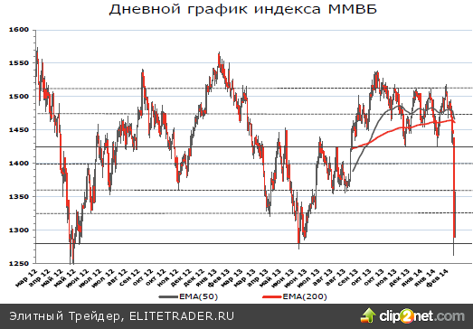 Во вторник, 4 марта, индекс ММВБ уже на старте торгов отскочил вверх, в диапазон 1320 – 1340 пунктов. Затем рост стал более поступательным и остановился в районе 1360 пунктов (на закрытие 1356,54 пункта, +5,26%). Фоном для отскока стало снижение геополитической напряженности, особенно после пресс-конференции В.Путина, заявившего, что применение войск на территории Украины рассматривается только как крайняя мера.