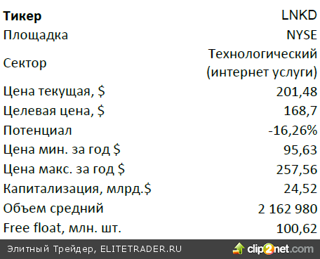 В силу всего вышеупомянутого, мы считаем целесообразным снизить целевой ориентир цены акций LinkedIn до $168,7 (потенциал снижения - 16,3%) и оставить рекомендацию «продавать».