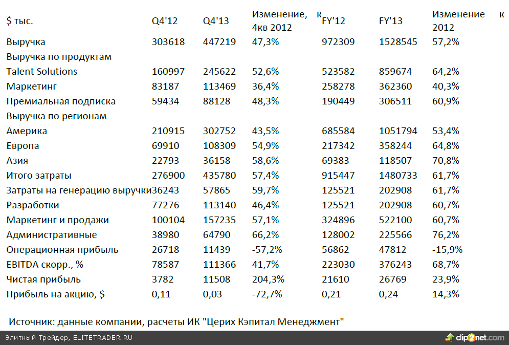 Выручка за четвертый квартал выросла на 47% по сравнению с аналогичным периодом прошлого года и составила $447,3 млн. Наибольший прирост выручки продемонстрировал сегмент содействия трудоуст- ройству кандидатов - 53%. Этот источник выручки составляет большую часть доходов компании и формирует порядка 55% общей выручки. Медленнее рос сегмент маркетинговых услуг - 36%. Выручка по итогам 2013 года увеличилась до $1 528 млн. (прирост 57%) по сравнению с $972 млн. годом ранее. В це- лом отмечается устойчивая тенденция снижения темпов роста квартальной выручки.