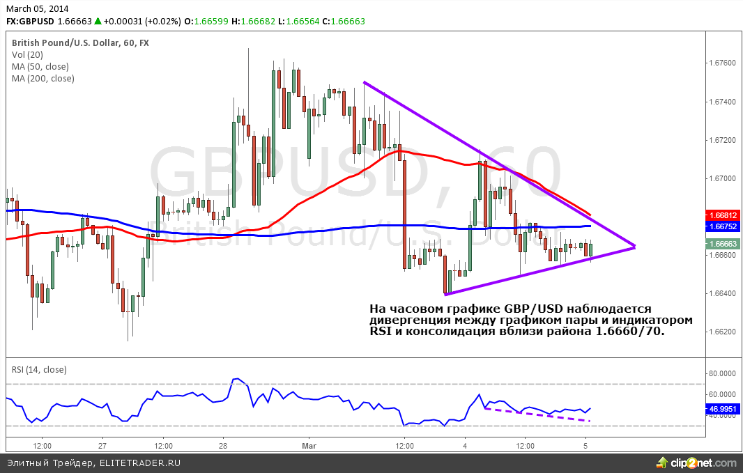 Расчеты по индексу деловой активности в строительном секторе Великобритании за февраль составили 62.6 пункта, что оказалось ниже прогнозируемого экономистами значения в 63.6 пункта. На фоне этой статистики валютная пара GBP/USD показала снижение от уровня 50 часовой скользящей средней (1.6710) и сейчас торги проходят по значению 1.6660 по нижней грани консолидации. Также стоит отметить наличие дивергенции на часовом графике пары, что позволяет ожидать в ближайшее время зарождения трендового движения.