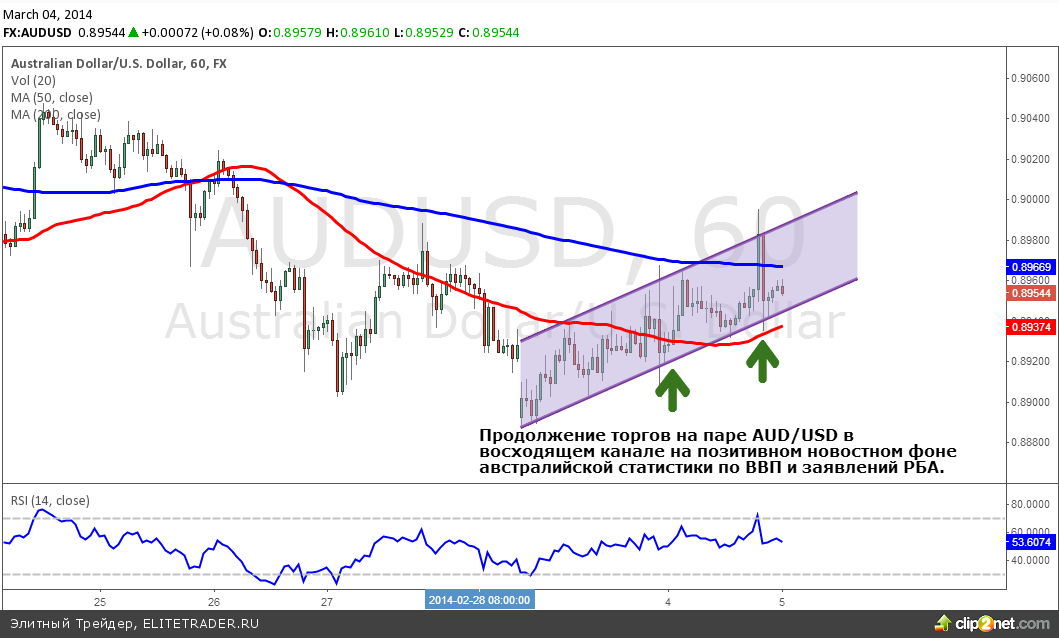 Сегодня утром были представлены отчеты об увеличении темпов экономики Австралии на 0.8% в 4 квартале, что превысило предполагаемое аналитиками значение 0.7%. Пара AUD/USD на новостях в последние торговые сессии образовала восходящий канал.