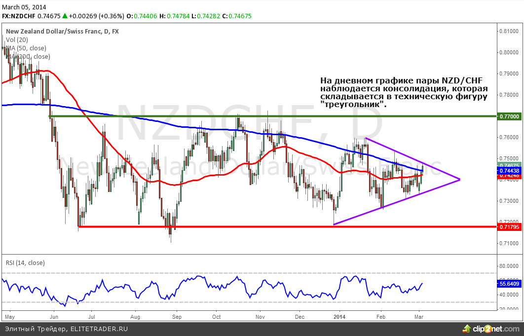Также стоит обратить внимание на интересную торговую ситуацию, сложившуюся на дневном графике пары новозеландский доллар к швейцарскому франку (NZD/CHF). Целями для тренда на снижение станет уровень минимумов 0.7180. Фиксировать прибыль при развитии тренда на рост стоит при достижении уровня 0.7700.