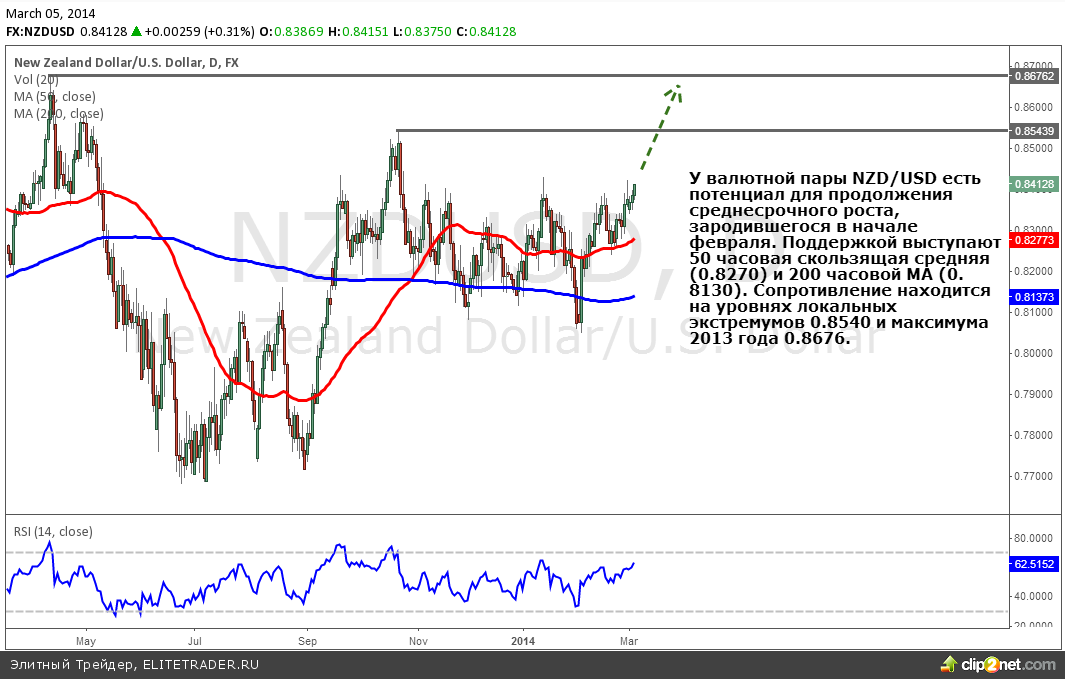 Новостным фоном, сопутствующим торгам на парах с новозеландским долларом, становится ситуация на Украине и слухи о предстоящем заседании ЦБ островного государства. Спад обострения конфликта между Россией и с другой стороны Укриной и стран НАТО вокруг Крыма сыграл в пользу быков на “киви” и к закрытию длинных позиций (на покупку) на надежных активах. Также обновленный консенсус-прогноз аналитиков по процентной ставке предстоящего на следующей неделе в четверг заседания Резервного банка Новой Зеландии создает дополнительную интригу. Предполагается начало повышения процентной ставки РБНЗ с текущего самого минимального уровня в 2.5% до 2.75%. До этого момента не предполагается публикации значимой макростатистики или выступлений важных новозеландских финансовых деятелей, слова которых могли бы повлиять на курс валюты. До этого момента вполне вероятно флэтовое развитие торгов. Коррективы в ход торгов может внести публикация на этой неделе в пятницу данные по числу занятых рабочих мест в США (Non-Farm Employment Change).