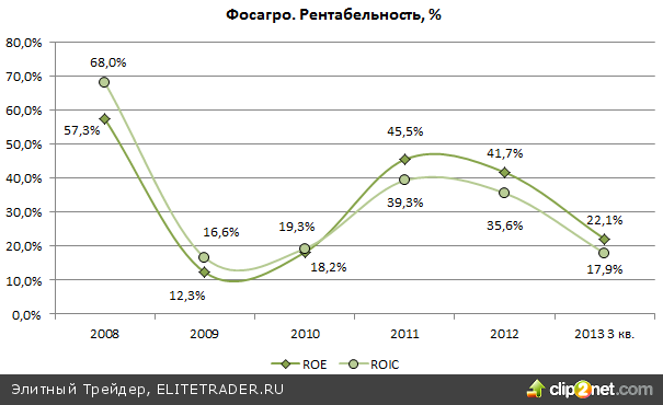 Во-вторых, из графика видно, что в прошлом году (расчет на конец 3-го квартала в годовом выражении) рентабельность Фосагро сильно упала — почти до уровней кризисного 2009 года. Это явилось результатом тяжелой рыночной ситуации для производителя в 2013 году. Тем не менее, даже с учетом столь сильного снижения оба коэффициента находятся на весьма высоких уровнях в абсолютном значении — приблизительно в 20%, что говорит о способности компании даже в кризисные периоды показывать в общем неплохие результаты.