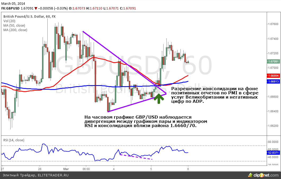 Вчера состоялась публикация позитивных расчетов по индексам деловой активности PMI в сфере услуг еврозоны и Великобритании. Представленные цифры превысили прогнозы экспертов. Также порадовали инвесторов отчеты по экономическому развитию стран европейского региона. Согласно предварительным расчетам ВВП вырос на 0.3%, что полностью совпало с консенсус - прогнозами ранее опрошенных экономистов. Европейская валюта в паре с долларом США (EUR/USD) не смотря на новости проводит торги в преддверии заседания ЕЦБ в коридоре 1.3720 – 1.3740. Также вчера были представлены ожидания агентства ADP по количеству созданных рабочих мест в феврале в США. Они считают, что было создано 139 тысяч рабочих мест против ожидаемого значения в 159 тысяч. Британский фунт в паре с валютой США (GBP/USD) вышел из границ консолидации, ранее обозначавшейся в обзорах аналитиками Romanov Capital. На фоне британских позитивных новостей и разочаровавшей статистики по прогнозам на Non-Farm фунт получил поддержку и вырос до отметки 1.6740.